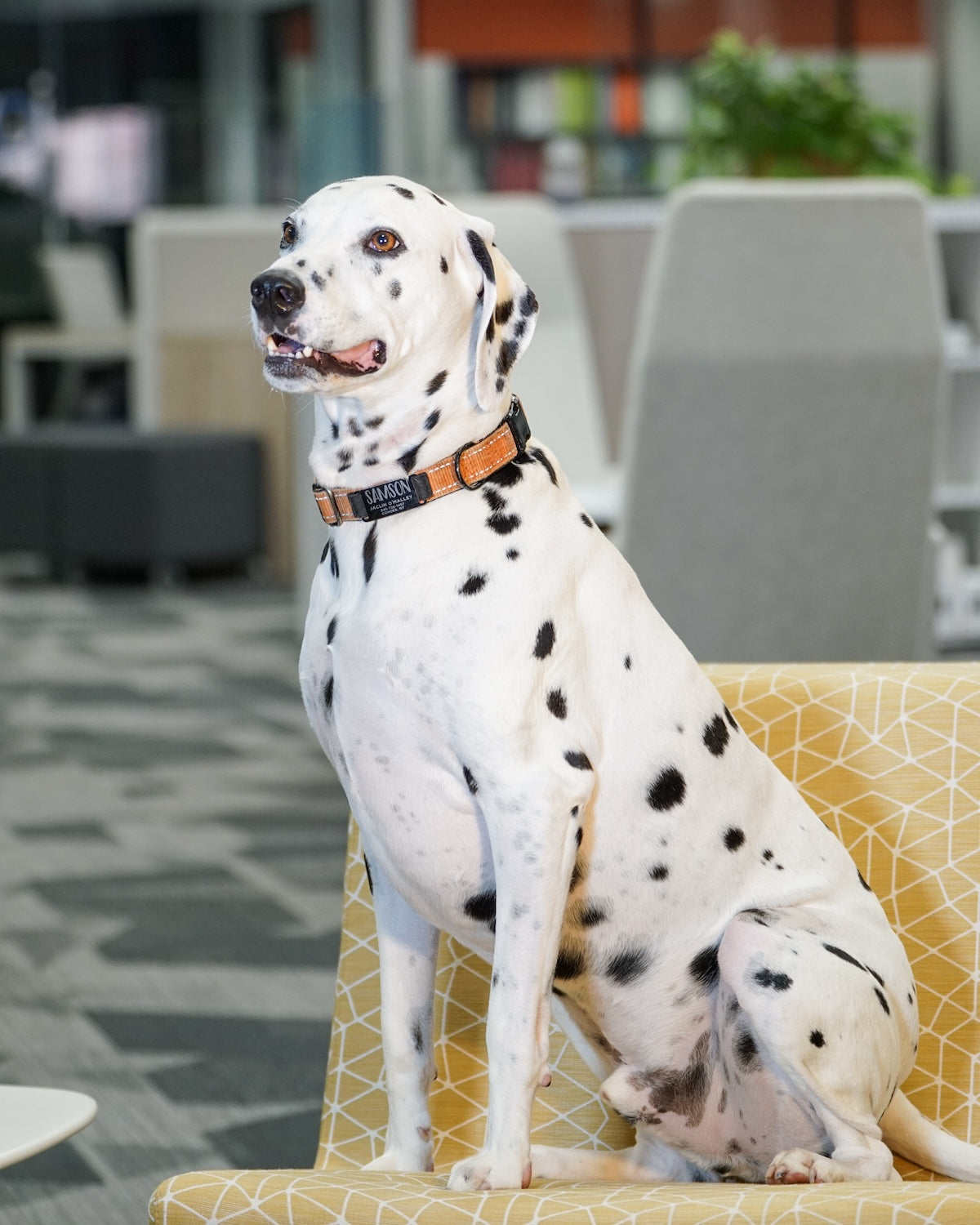 Samson takes to social media every Wednesday to highlight his favorites spots throughout the showroom in his segment called “Samson’s ‘spot’ of the week”. He keeps his paws busy ensuring showroom security by chasing out the occasional mail carrier, testing out the comfiest furniture, greeting clients with a loud howl, and then resting under his favorite desks.