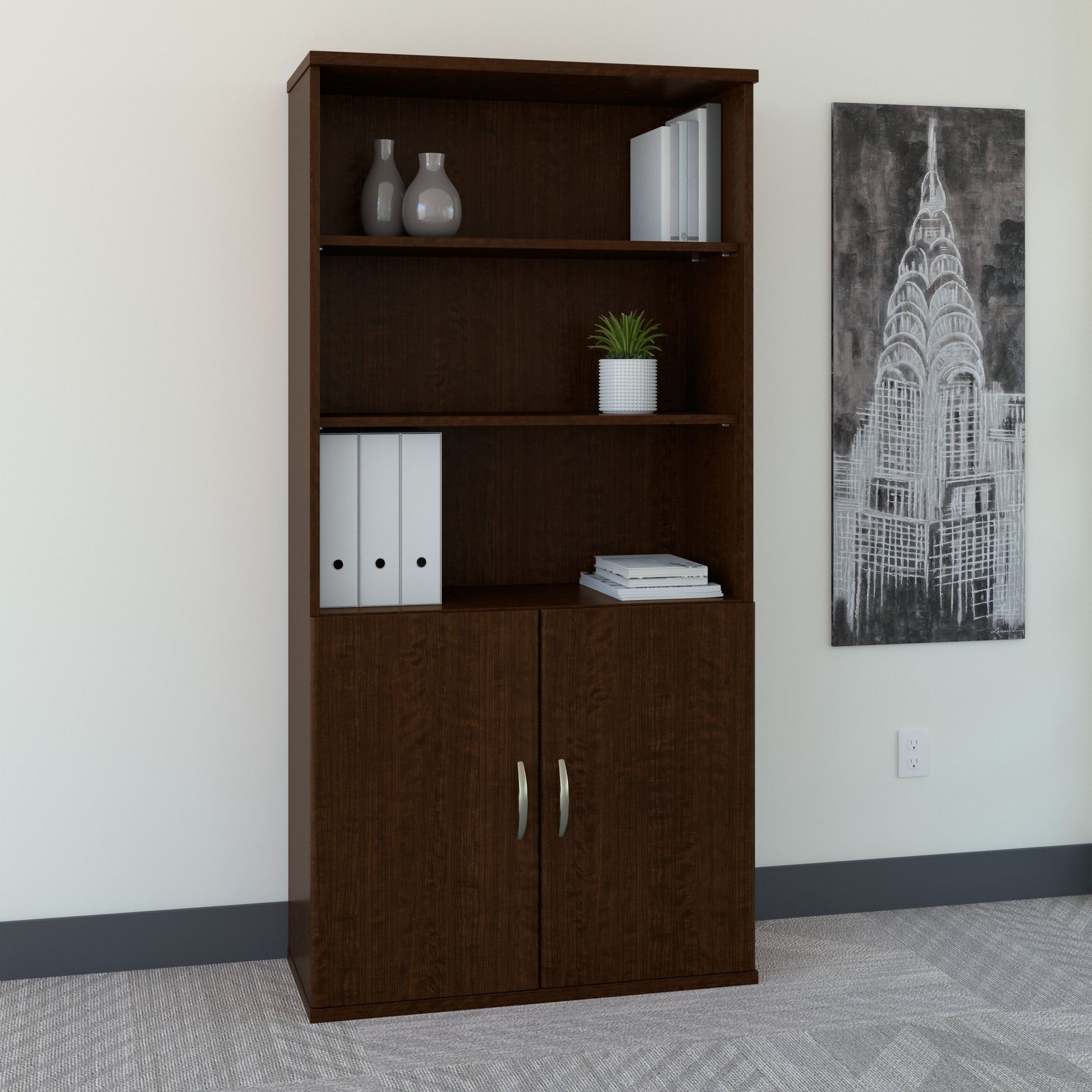 The Bush Business Furniture Series C 36W 5 Shelf Bookcase with Doors brings open display space and concealed storage to your office. Backed by commercial-grade quality, the Bookcase boasts a classic design and includes three adjustable shelves for displaying books, binders or objects of varying heights. Two doors with self-closing Euro-style hinges conceal the lower shelves, providing the perfect place for office supplies. Two fixed shelves ensure stability, while the heavy-duty construction stands up to years of use. Add one Bookcase to your home or office, or combine two or more to create a storage wall. Series C offers endless layout options, expansion opportunities and 7 finishes. This affordable office furniture withstands the rigors of a 40-plus hour work week and comes with a 10 Year Warranty. American made with U.S. and imported parts.