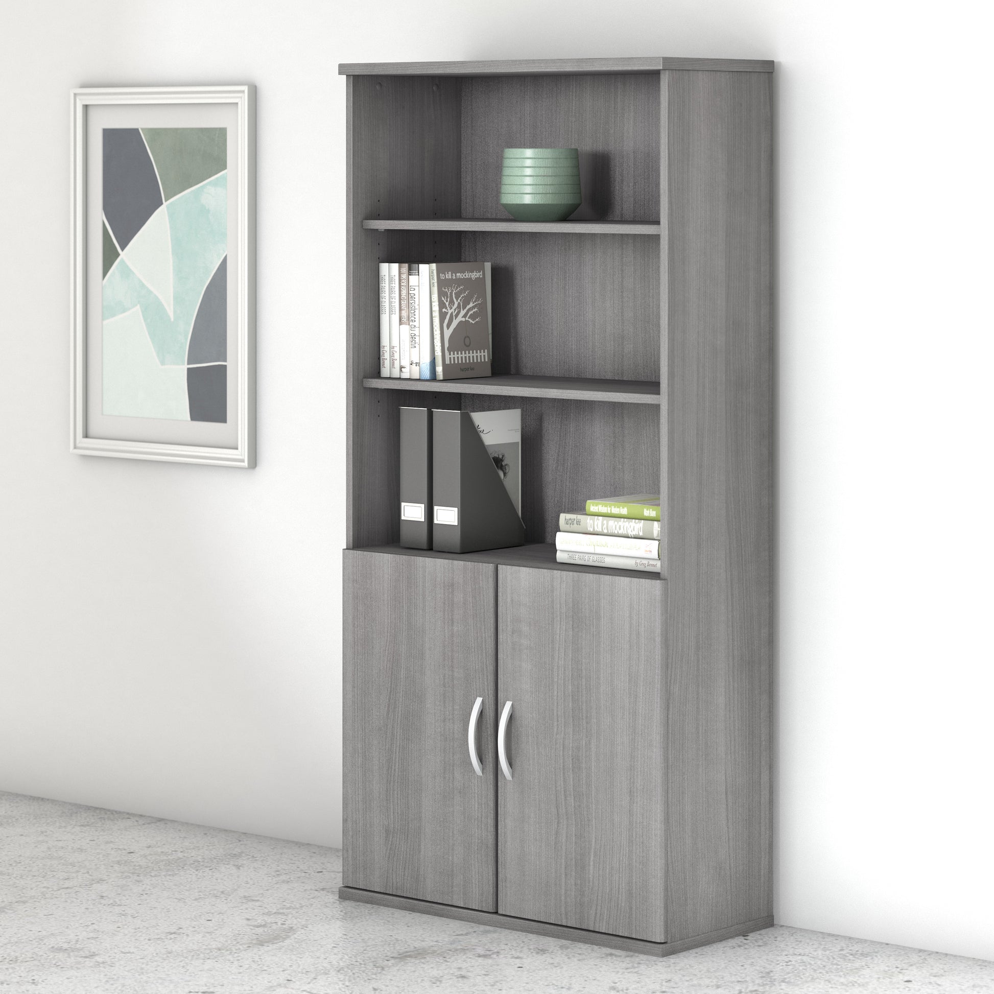 The Bush Business Furniture Studio C 5 Shelf Bookcase with Doors looks great, works hard and adjusts to fit the needs of your office. Designed with two fixed and three adjustable shelves, the Bookcase holds your books and reference materials with plenty of room for your favorite decorative accents. Confidently store a variety of items on the spacious and durable shelves, designed to hold up to 50 lbs each. A thermally fused laminate finish fends off everyday damage like scratches and stains throughout years of everyday use. Two doors with smooth Euro-style hinges conceal your office supplies and add an eye-catching touch to your workspace. This tall Bookcase with Doors comes with a 10 Year Warranty and meets ANSI/BIFMA quality test standards. See the full collection for coordinating items available to make your office your own with Studio C. American made with U.S. and imported parts.