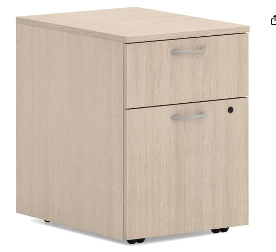 - Finished in scratch, spill, and stain-resistant Desert Oak laminate, this office file cabinet maintains a pristine look, serving as a reliable office drawers under desk solution